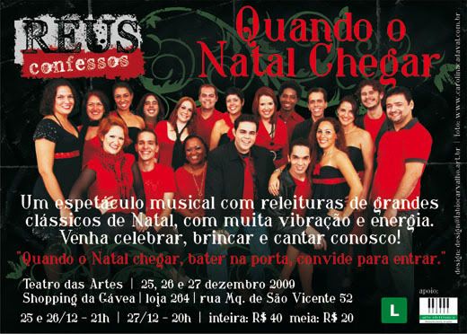 flyer eletrônico (para envio por email) do espetáculo Quando o Natal Chegar, do grupo vocal Réus Confessos, no Teatro das Artes - Shopping da Gávea, Rio de Janeiro
